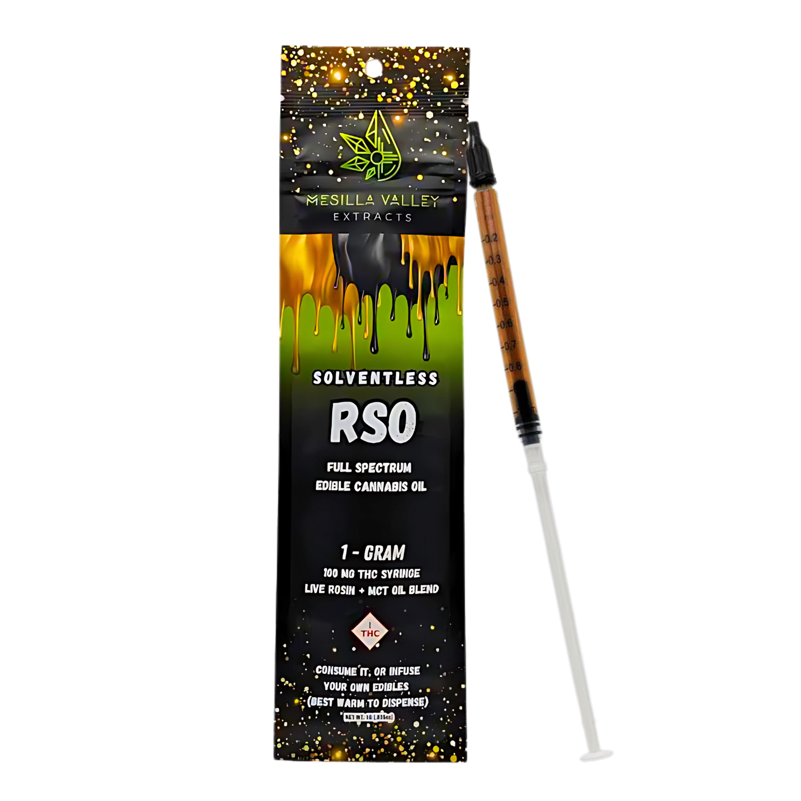 Make your own edibles with the first recreational solventless RSO syringe in New Mexico! Full spectrum solventless live rosin oil in a 1 gram/ 1 milliliter syringe, intended for recreational use. No heating required prior to dispensing. 100mg of THC.